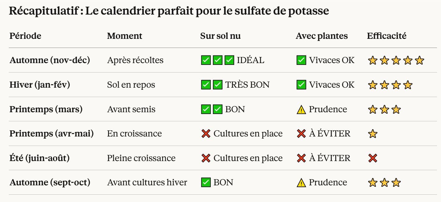 2. Temps d'assimilation → Le sulfate de potasse a besoin de 2-3 semaines minimum pour commencer à se dissoudre et être disponible → Si vous l'apportez avant plantation, les plantes trouvent le potassium dès qu'elles s'installent